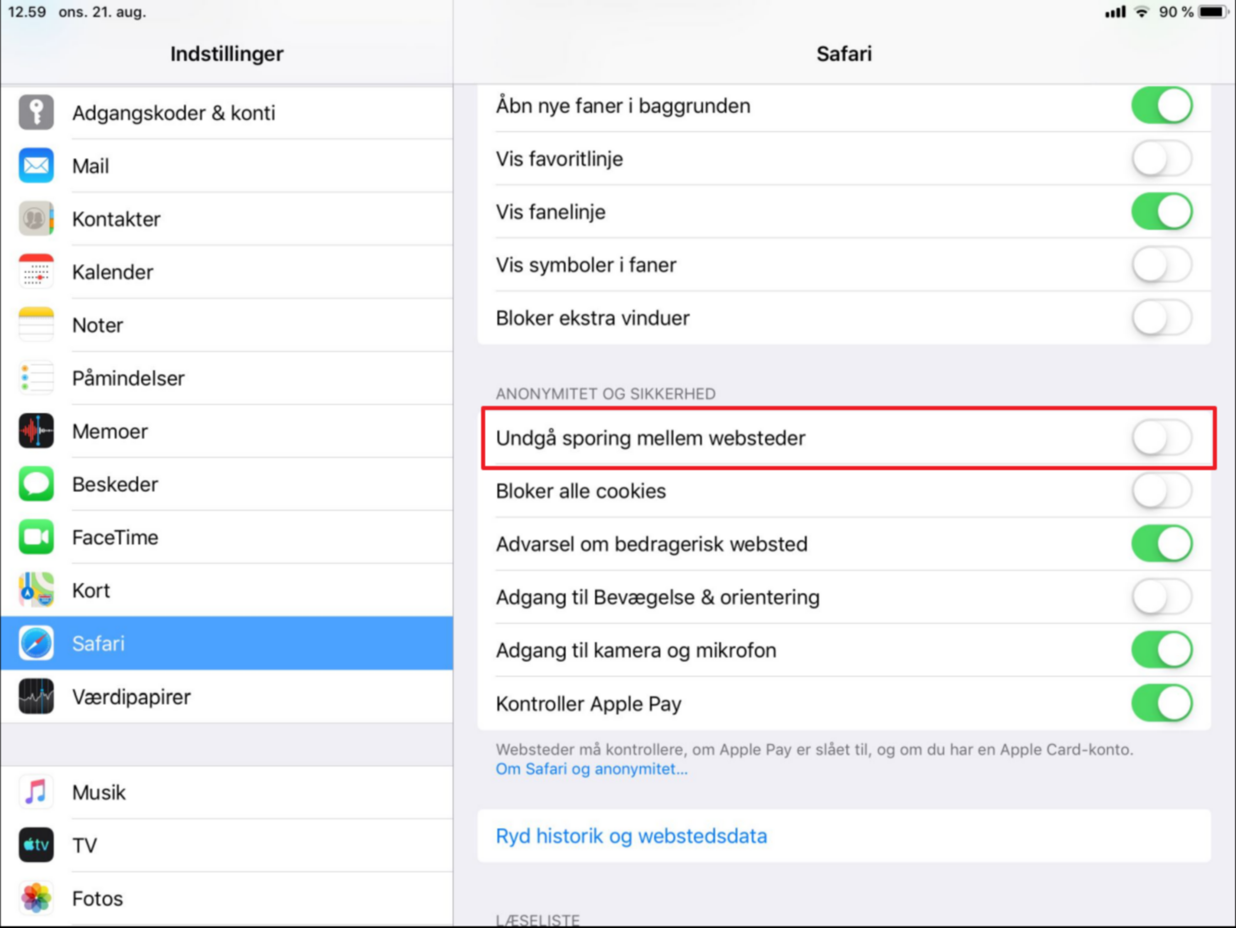 Det drejer sig om en indstilling i Safari browseren på iPad’en, skal ændres. Du skal ind i Indstillinger > Safari > Anonymitet og sikkerhed og finde den indstilling der hedder ”Undgå sporing mellem websteder”. Den skal være slået FRA for at vores apps virker, da de er afhængige af netop at vi kan ”spore” en session fra ”http://vejman.vd.dk ” over på ”http://apps.vejman.dk ”. (Se den røde boks nedefor)