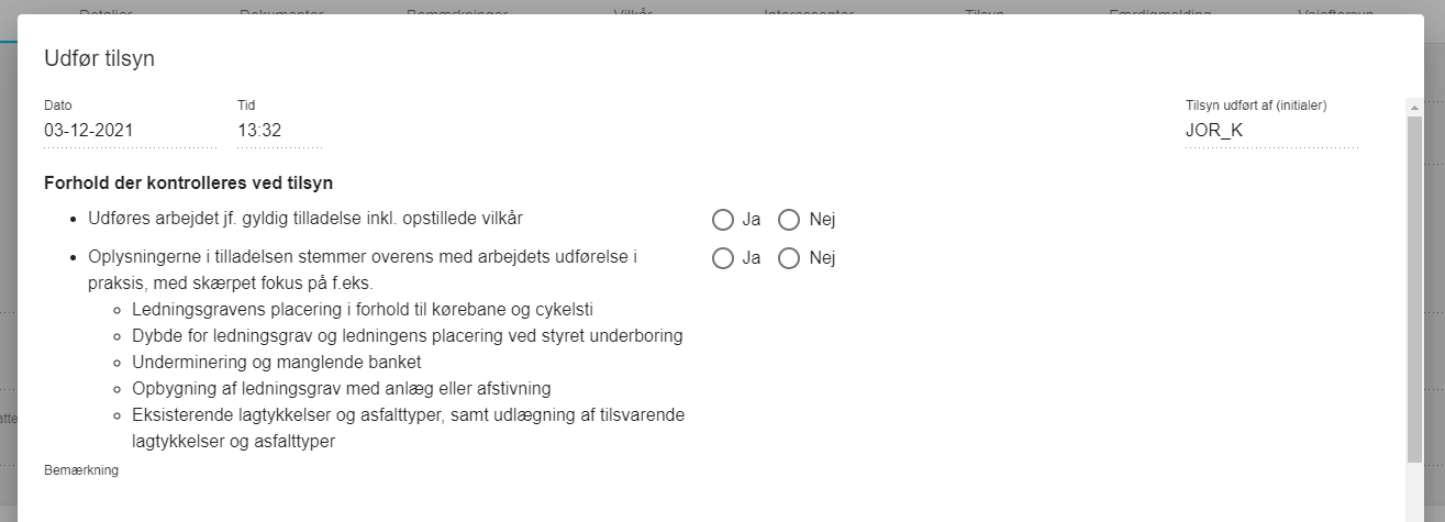 Hvis der svares 'Nej' til spørgsmålene vises et bemærkningsfelt i forbindelse med spørgsmålet, som er obligatorisk at udfylde.
