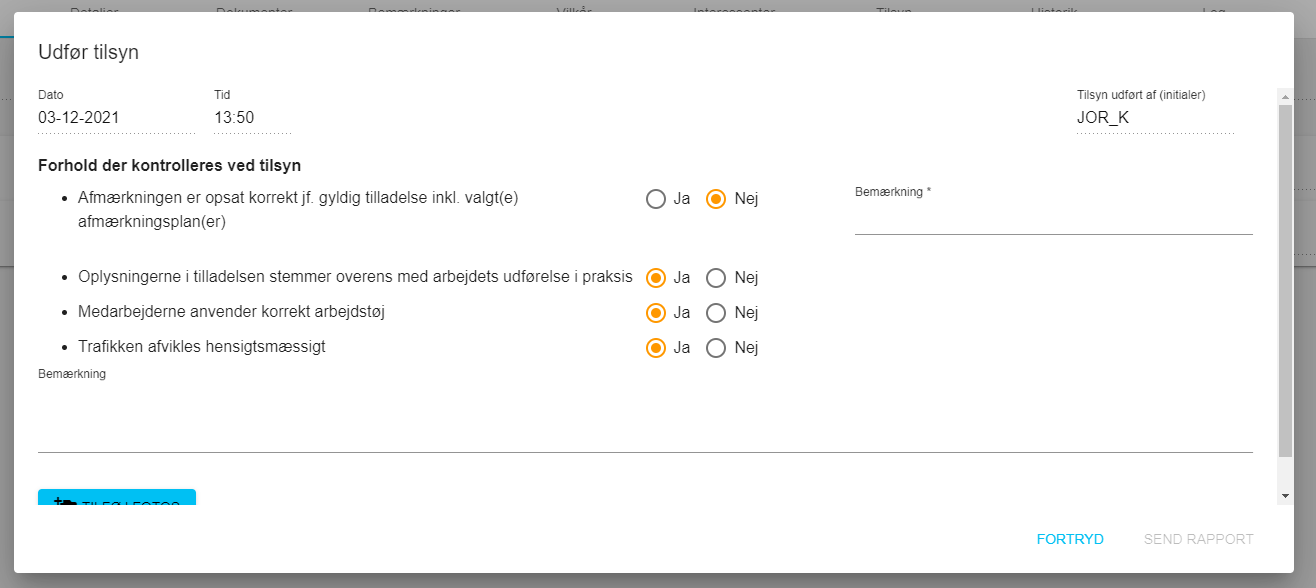 Der findes på alle typerne et generelt bemærkningsfelt som kan udfyldes hvis der er generel information der skal noteres på tilsynet.