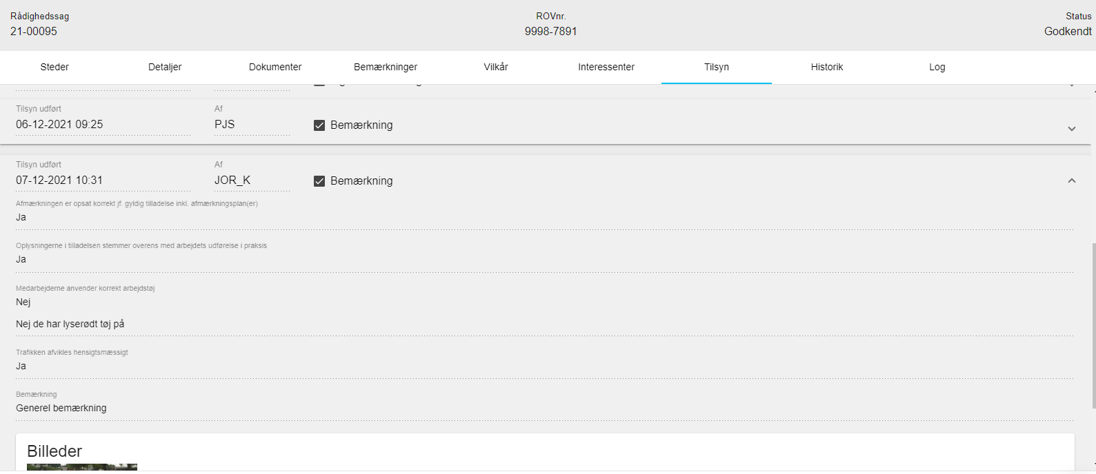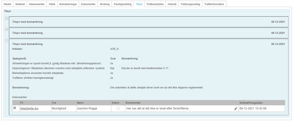 Når et tilsyn er udført og registreret i Eftersyn og Tilsyn, vil det blive vist på sagen både i Eftersyn og Tilsyn samt i Vejman.