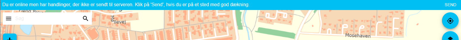 Når man kommer online igen, vil en blå bjælke i toppen af skærmen give besked om, at der ligger ændringer i køen som kan sendes afsted. Ved tryk på ’Send’ knappen i højre hjørne får man vist indholdet af offline køen og man kan her trykke ’Send’ for at sende alle ændringer afsted så de bliver afspejlet på sagerne. Man kan også vælge at slette ændringer fra køen, hvis man har fortrudt, har lavet en fejl, eller en ændring blokerer for en anden ændring. Det er nemlig sådan at man kun kan lave én ændring pr. sag som forårsager statusskift. Skal man lave en ændring der forårsager statusskift på en sag hvor der allerede ligger en ændring der forårsager statusskift i offline køen, er man nødt til at slette den tidligere ændring først.