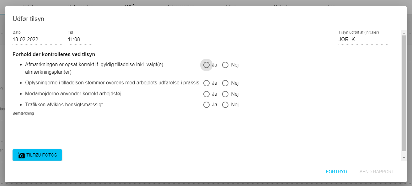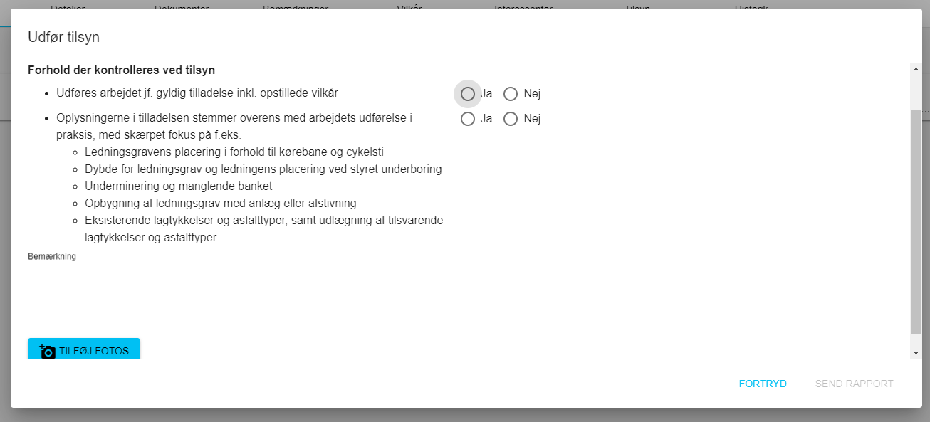 Det er muligt at skrive en generel bemærkning til tilsynet, ligesom det er muligt at vedhæfte fotos og skrive bemærkninger til hvert foto.