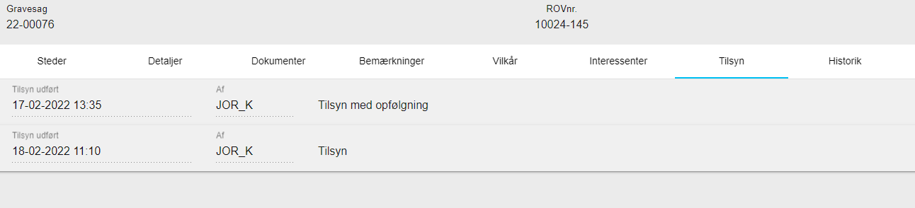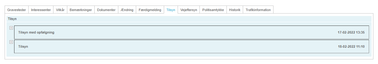 Når et tilsyn er udført, vil det fremgå på sagen, både i Eftersyn og Tilsyn og i Vejman tilladelser, hvor en dedikeret fane viser en komplet liste over alle tilsyn der er udført på den givne sag. Alle informationer fra tilsynet vil fremgå på disse faner.