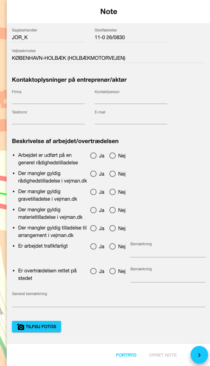 Alle spørgsmål, svar, fotos og bemærkninger vises på noten i Vejman Tilladelser.