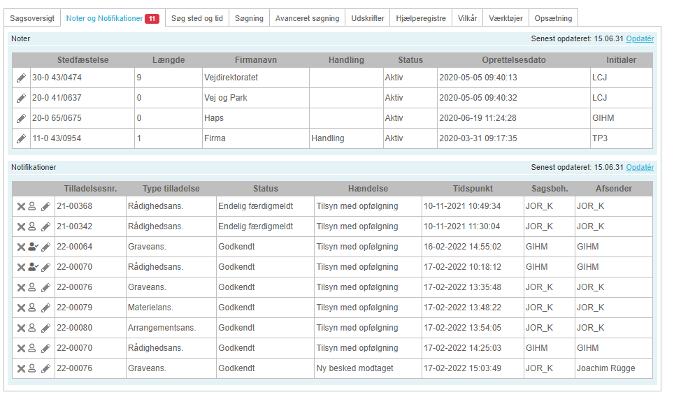 En ny fane er derfor indført i http://Vejman.dk Tilladelser som hedder ’Noter og Notifikationer. Fanen viser to ting; Noter og Notifikationer. Noterne der vises er de noter der kunne slås til i opsætningen og som tidligere blev vist i forbindelse med sagsoversigten. De er blevet flyttet til den nye fane, men er derudover ikke blevet ændret yderligere.