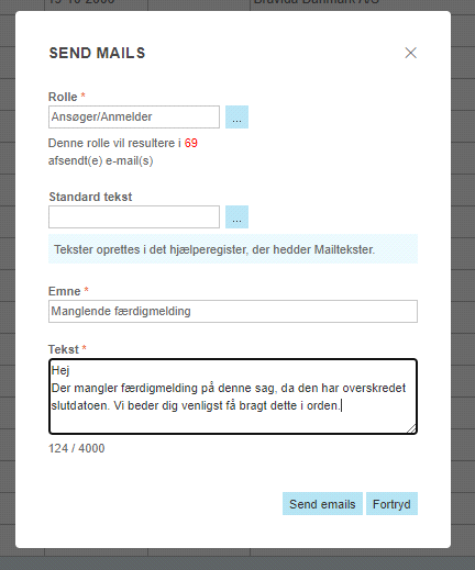 Man kan nu klikke på knappen ’Send mails til…’ for at sende en énslydende mail ud til en specifik modtager på samtlige sager.