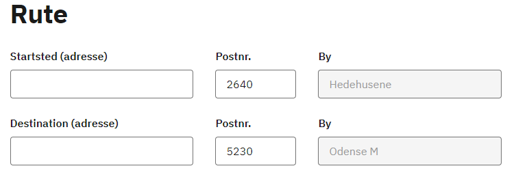 Når et postnr. indtastes i felterne til Startsted og Destination, vil det automatisk blive vist hvilken by der hører til, så ansøger ikke er i tvivl om at der er indtastet korrekt postnr.