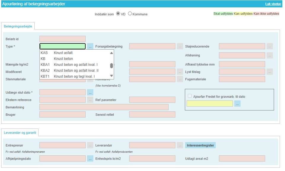 Oprettelse af nye belægningstyper i Belægningsarbejder registeret