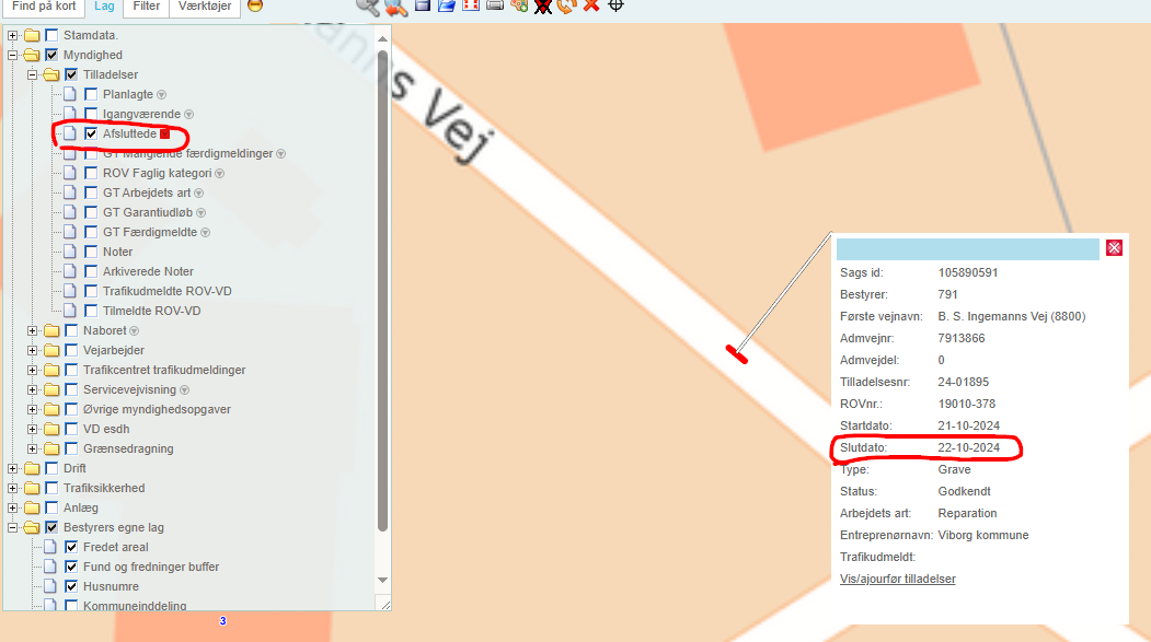 Kortlaget myndighed/tilladelser/afsluttede virkede som til og ikke til og med. Dvs hvis en gravesag har slutdato d. 22.10.2024 så optrådte den allerede som afsluttet, selvom den i princippet burde være igang til og med kl. 23.59 på slutdagen.