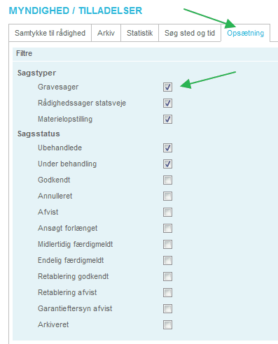 Her kan du indstille sagstyper du vil se, og ændre på de kolonner, der skal vises.