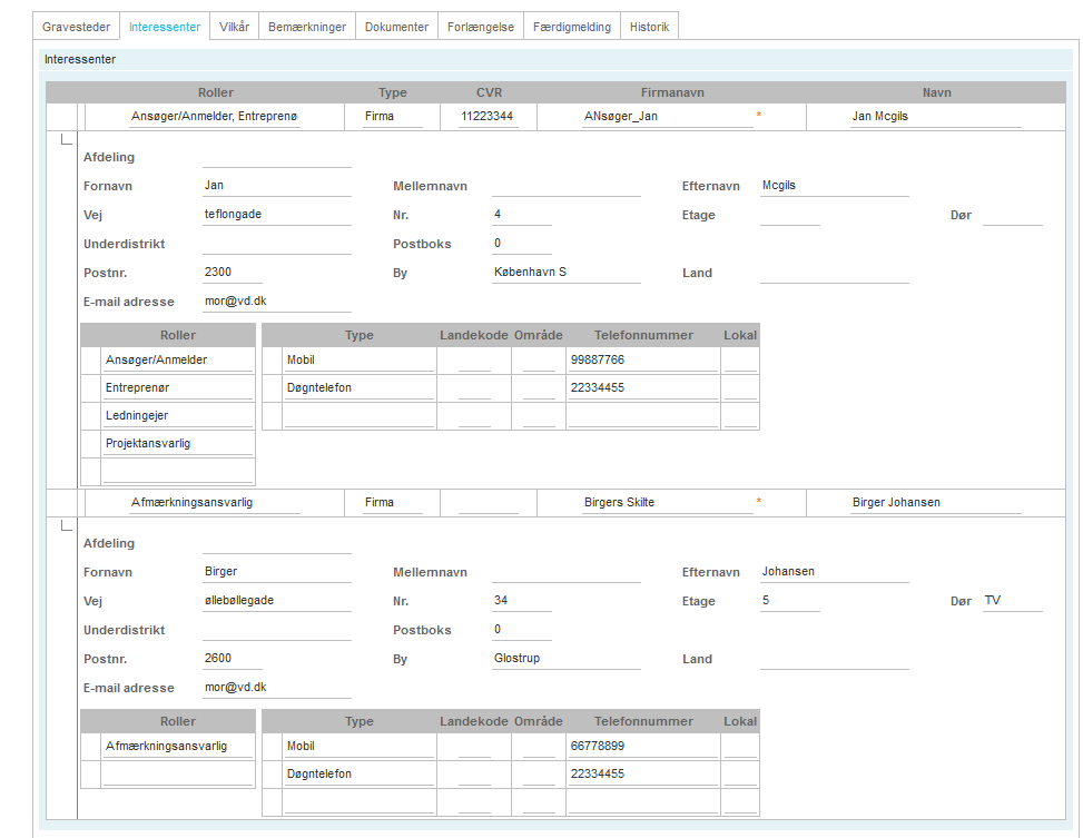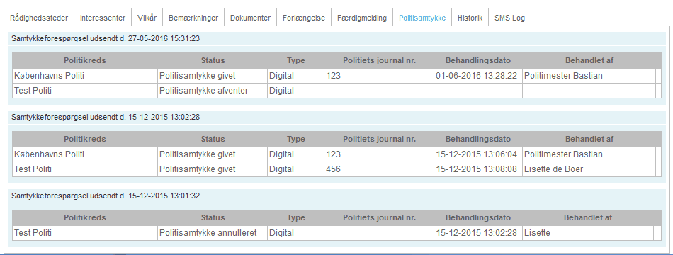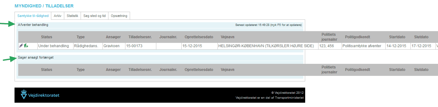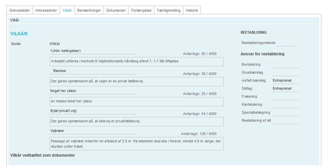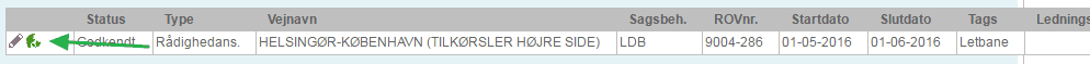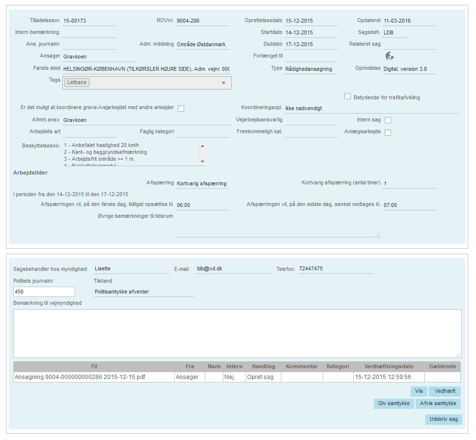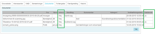 Se dokumenter, sendt mellem ansøger og vejmyndighed samt politiet kan læses her. Undtaget for læsning er er interne dokumenter (intern = Ja). Vejmyndigheden kan løbende mærke de gældende dokumenter af, hvis der skulle komme flere versioner i løbet af sagsbehandlingen. Det afspejles i kolonnen: Gældende.