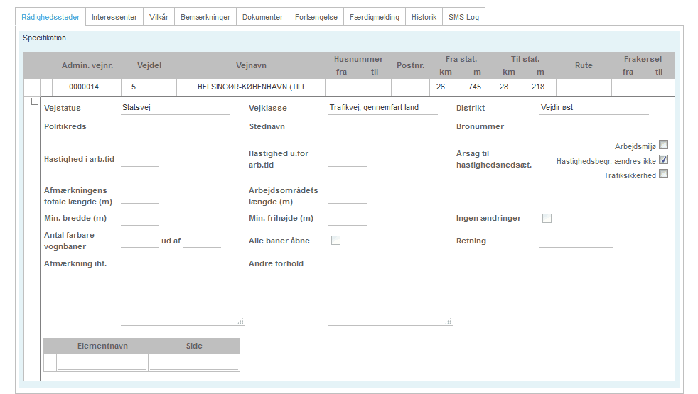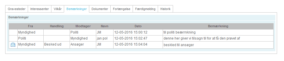 Se bemærkninger, samt beskeder sendt mellem ansøger og vejmyndighed, og bemærkninger til politiet fremgår. Undtaget er myndighedernes interne bemærkninger.