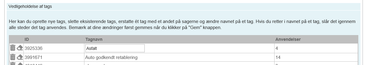 Det er gjort lettere for lokal administrator at vedligeholde tags. De kan nu ikke bare oprettes og slettes på Systemadministrationssiden, men også erstattes med et andet eller tagnavnet kan ændres. Samtidig kan lokal administrator se, hvor ofte et tag er anvendt (det tælles med hvis det er brugt i en regel):