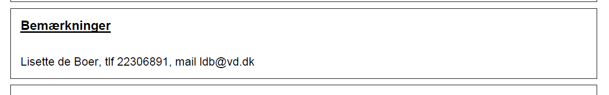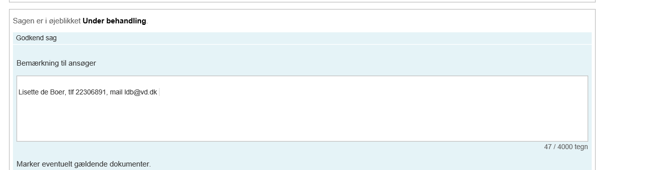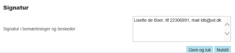 Den tekst, du gemmer i feltet, vil automatisk blive lagt i enden af alle bemærkninger, du herefter skriver til ansøgeren. Den bliver også automatisk lagt på Tilladelsen og Afvisningen, medmindre du sletter den i forbindelse med tilstandsskiftet: