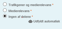 I forbindelse med opsætning af felter omkring trafikudmelding anvender vi nu automatisering til at forudfylde felter om trafikgener og medierelevans. Hvis felterne er sat automatisk fremkommer et lille robot ikon. Værdi kan frit ændres hvorefter ikon forsvinder.