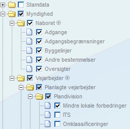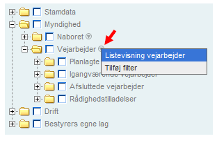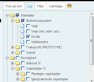 Under Lag-punktet i menulinjen kan der med flueben vises planlagte, igangværende og afsluttede vejar- bejder samt rådighedstilladelser.