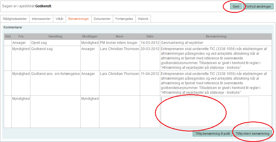 Ved at klikke på Tilføj bemærkning aktiveres feltet, hvori der kan indtastes bemærkninger til øvrige medarbejdere i VD. Efter bemærkningerne er indtastet, afsluttes ved at taste Gem.