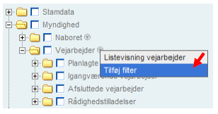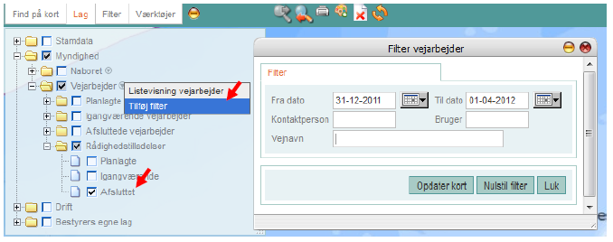 Under Filter-punktet i menulinjen øverst i browseren kan der opsættes et generelt filter for visningen af de afkrydsede vejarbejder, f.eks. på vejcenter.